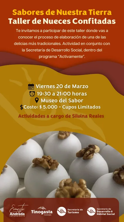 La Municipalidad de Tinogasta, a través de su Secretaría de Turismo, anunció la realización de un taller dedicado a la elaboración de nueces confitadas, una de las delicias más representativas de la gastronomía local. La propuesta se enmarca en el programa “Activamente”, impulsado en conjunto con la Secretaría de Desarrollo Social.