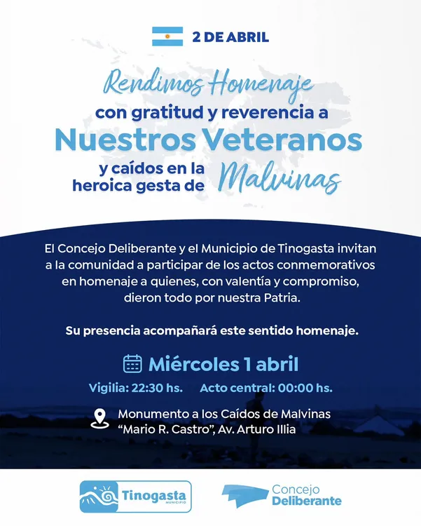 El Concejo Deliberante y el Municipio de Tinogasta anunciaron la realización de actos conmemorativos en homenaje a los veteranos y caídos en la gesta de Malvinas. La convocatoria, dirigida a toda la comunidad, busca rendir tributo con gratitud y reverencia a quienes defendieron la Patria con valentía y compromiso.
